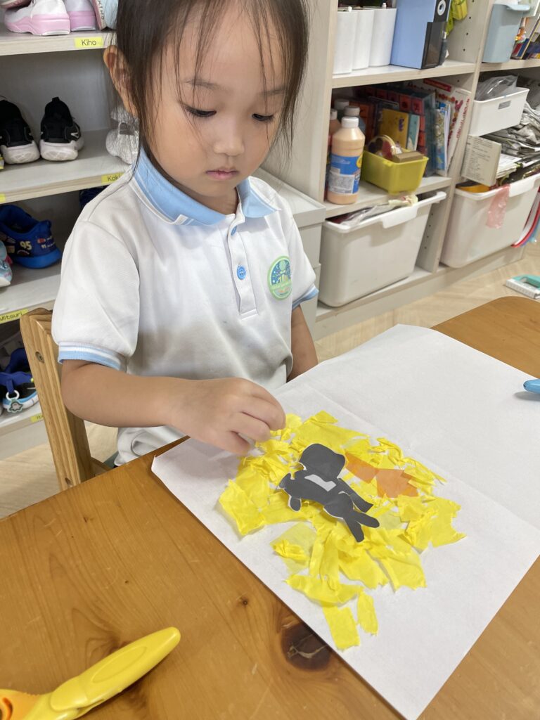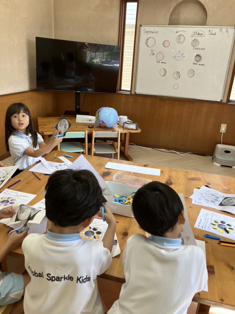 今夜は中秋の名月が見れますね!今週に入り、月の満ち欠けや月の形について学んだ年中・年長さん。