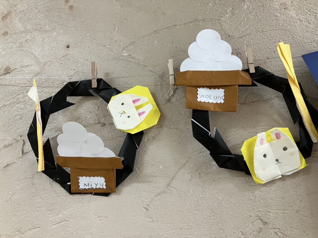 ”It’s too difficult!”と言いながら頑張ってお月見リースを折り紙で作った年長クラス。