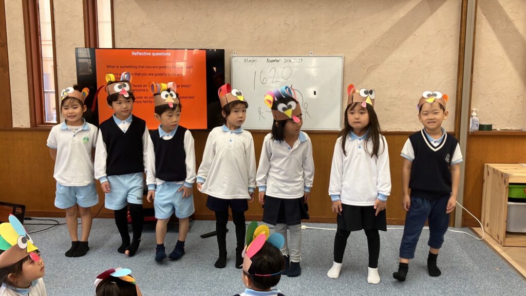 Thanksgiving Dayはすべてにおいて感謝をする日ということで、年長Dahliaクラスと年中Ivyクラスは誰に何を感謝するのか、みんなの前で話してもらいました。話してもらいました。周りに感謝して毎日過ごせると幸せですね。