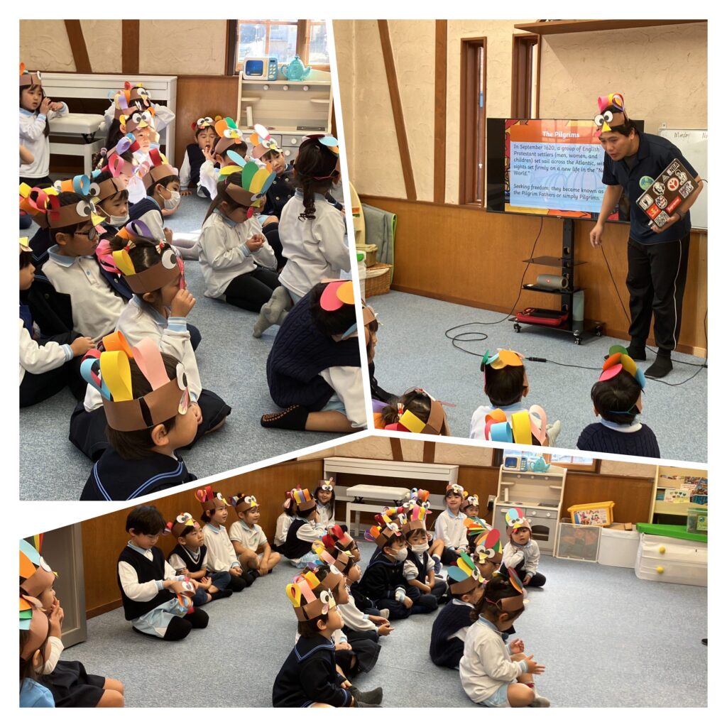 クラフトでTurkeyのヘッドバンドを作って、皆でTurkeyになって、Klein先生のThanksgiving day Lessonを受けました。
