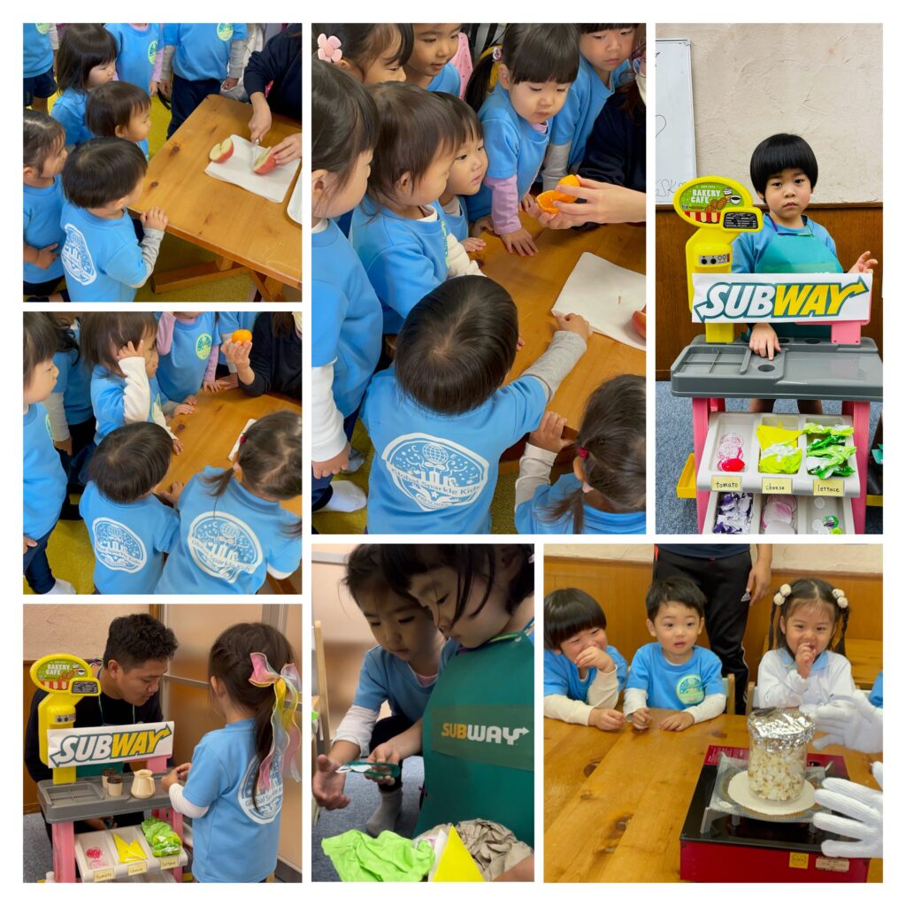 小さい子クラスでは食べ物の名前や色を学び、アクティビティーでは本物のりんごを見せて、”What color is it? It’s red.” その後に、目の前でリンゴを半分に切り、もう一度”What color is it? It’s white.””There are seeds inside.”と実際に子ども達の目で見て、切る前の外見と切った後の中身の色の違いの発見をしました。