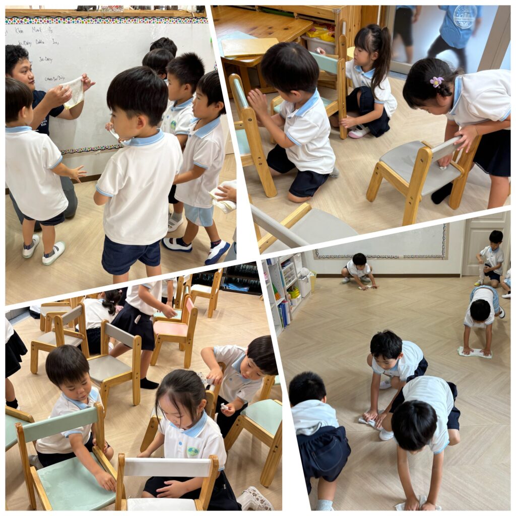 新しく仲間になった小さなお友達も園生活に少しずつなれ、年長クラスのお友達は4月から最年長としての自覚が芽生え、自らお手伝いをしてくれたり、小さい子に優しく接してくれたりと頼もしい姿がたくさんみられました。最終日には年中・年長の子ども達と一緒に椅子や床の雑巾掛けをしました。Thank you!