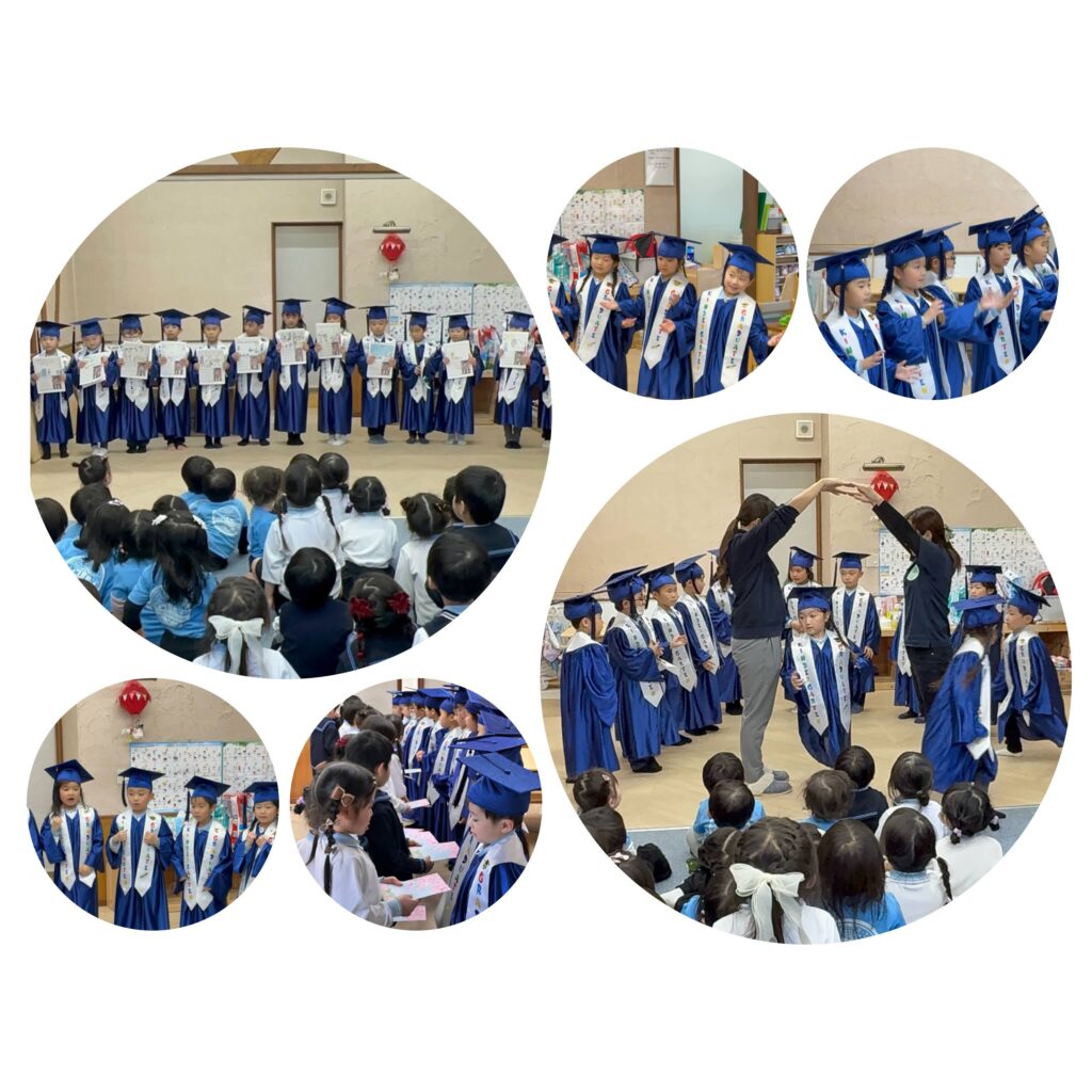 縦割りで過ごす時間も多いため、小さい子達は年長さんに助けてもらったり一緒に遊んでもらう事があります。そして、一緒に過ごす中でかっこいい年長のお兄さん、優しい年長のお姉さん達に憧れ、大きくなったら同じように自分より小さい子に優しくできる姿が沢山見られます。そして、この日はかっこいい卒園ガウンを着て登場した年長さん達に、小さい子達は目をキラキラとさせていました。やっぱり年長さんはかっこいいね!